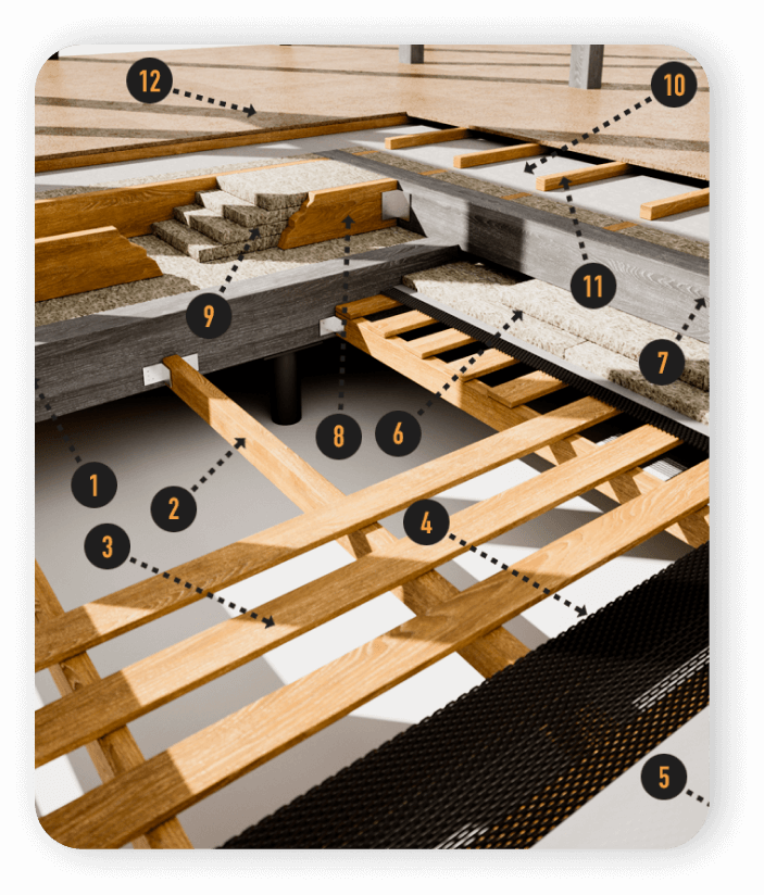 1. Обвязка — лага обвязки основания. Крепится к фундаменту, формирует основание для установки треугольных рам каркаса. Материал — сухая строганная доска 200х200 мм. 2. Лага системы поддержки нижнего контура системы утепления. Материал — сухая строганная доска 50х100 мм. 3. Основание для укладки нижнего контура системы утепления. Материал — сухая строганная доска 25х100 мм. 4. Защита от проникновения грызунов. Материал — металлическая решетка. 5. Ветрозащитная мембрана. Защищает нижний контур системы утепления от продувания и влаги. 6. Нижний контур утепления — 100 мм. Защищает основание треугольных рам каркаса от промерзания. Материал — минераловатный утеплитель, два слоя по 50 мм. 7. Деталь несущего каркаса A-Frame — основание треугольных рам. Материал — сухая строганная доска. 8. Основная лага перекрытия первого этажа. Крепится балкам основания треугольных рам несущего каркаса A-Frame. Материал — сухая строганная доска 50х200 мм. 9. Верхний контур системы утепления — 200 мм. Материал — минераловатный утеплитель. 10. Пароизоляция системы утепления. Материал — пароизоляционная пленка. 11. Брусок вентиляционного зазора. Фиксирует пароизоляционную пленку и формирует вентиляционный зазор. Материал — сухой строганный брусок 50х50 мм. 12. Основание для финишного покрытия пола. Материа — фанера 18 мм.