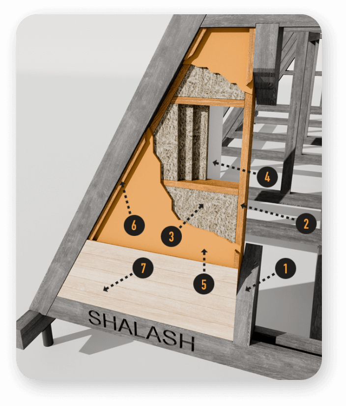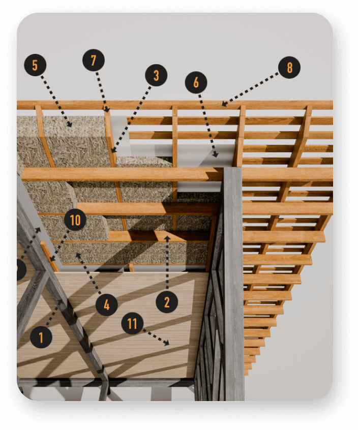 1. Деталь несущего каркаса A-Frame — стропильная деталь треугольной рамы. Материал — сухая строганная доска 50х200 мм. 2. Лага первого контура системы утепления. Формирует пространство первого контура утепления крыши. Материал — сухая строганная доска 50х150 мм. 3. Лага второго контура системы утепления. Формирует пространство второго контура утепления крыши. Мафтериал — сухая строганная доска 50х100 мм. 4. Первый контур системы утепления крыши — 150 мм. Материал — минераловатный утеплитель. 5. Второй контур системы утепления крыши — 100 мм. Материал — минераловатный утеплитель. 6. Ветрозащитная мембрана. Защищает систему утепления от продувания и влаги. 7. Контробрешетка кровли. Фиксирует ветрозащитную мембрану и формирует пространство для вентиляции подкровельного пространства. Материал — сухой строганный брусок 50х50 мм. 8. Обрешетка кровли. Является основание для монтажа кровельного покрытия. Материал — сухая строганная доска 20х100 мм. 9. Пароизоляция системы утепления. Материал — пароизоляционная пленка. 10. Брусок вентиляционного зазора. Фиксирует пароизоляционную пленку и формирует вентиляционный зазор. Материал — сухой строганный брусок 50х50 мм. 11. Финишная отделка интерьера . Материал — интерьерная доска 20х140 мм..